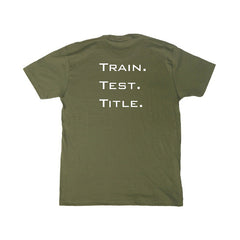 This 60/40 poly blended tee bears the Perfect mARC / TRAIN.TEST.TITLE. logos in orange and white and is colored military green. Front and back shown.